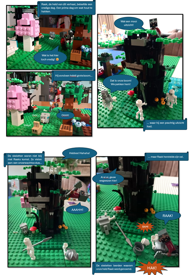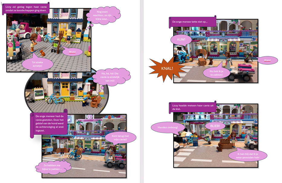 We komen op locatie samen met kinderen verhalen maken. Dat kan bijvoorbeeld in kleine groepen op school. We begeleiden de kinderen in het maken van een leuke compositie met speelgoed, bijvoorbeeld met Lego, en helpen ze met foto's maken.